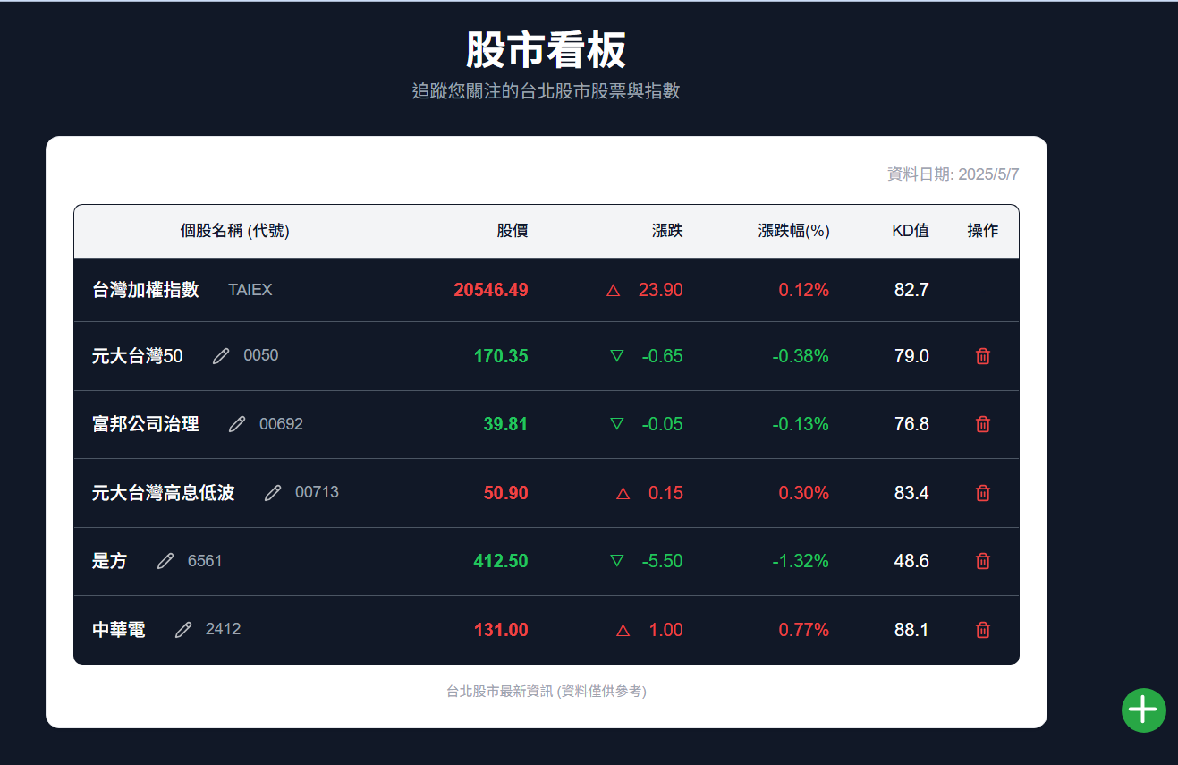 使用 https://api.finmindtrade.com/api/v4/data 取得股價,這不是即時的股價,而是收盤後才會更新的股價,反正我只是要觀察長期的KD值而已,不需要很即時。