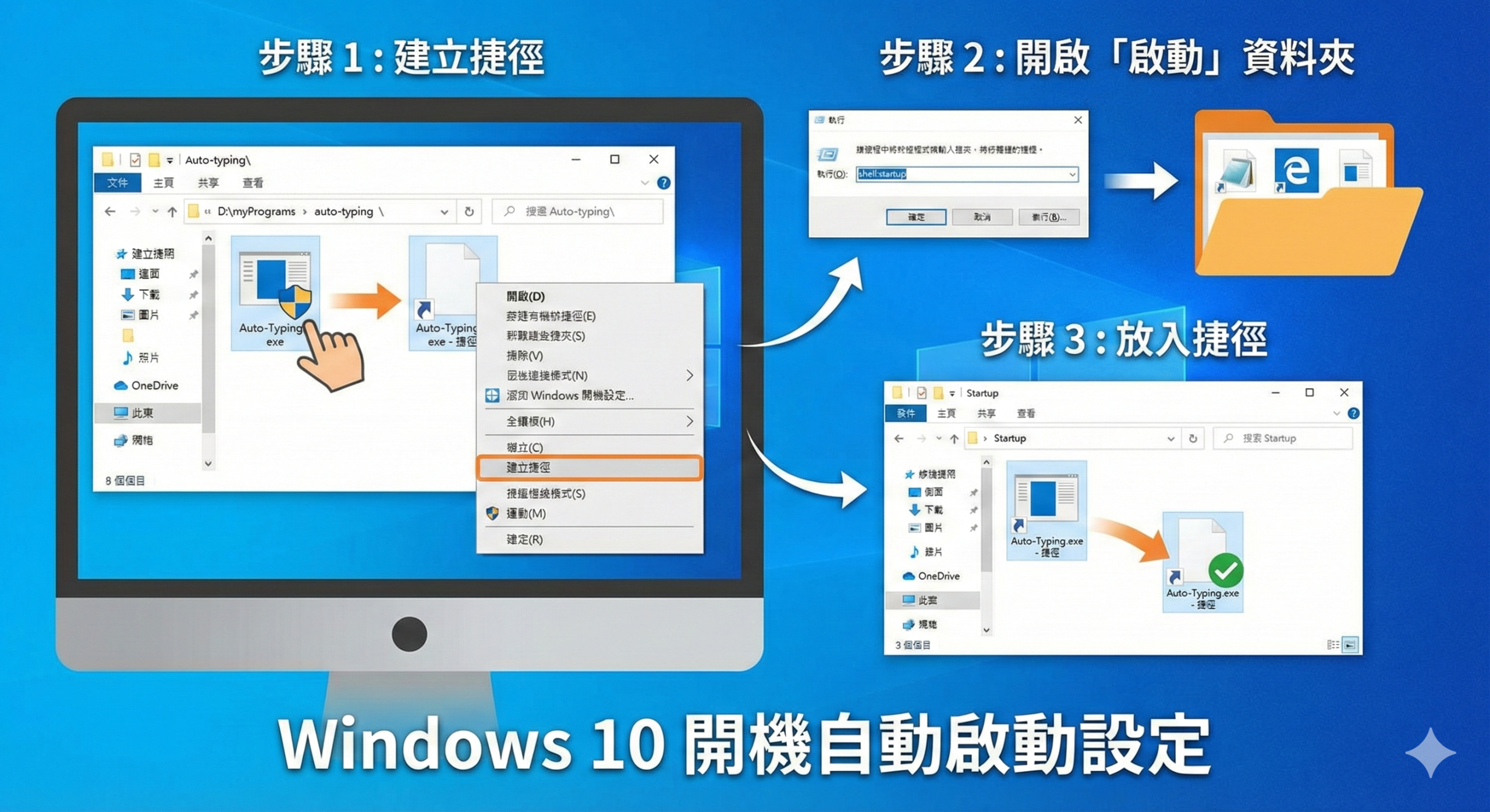 步驟 3:把捷徑丟進去,大功告成! 最後一步超級簡單!把你剛剛在步驟 1 建立好的 Auto-Typing.exe - 捷徑,直接用滑鼠拖曳(或是剪下後貼上)到步驟 2 打開的「啟動」資料夾中。