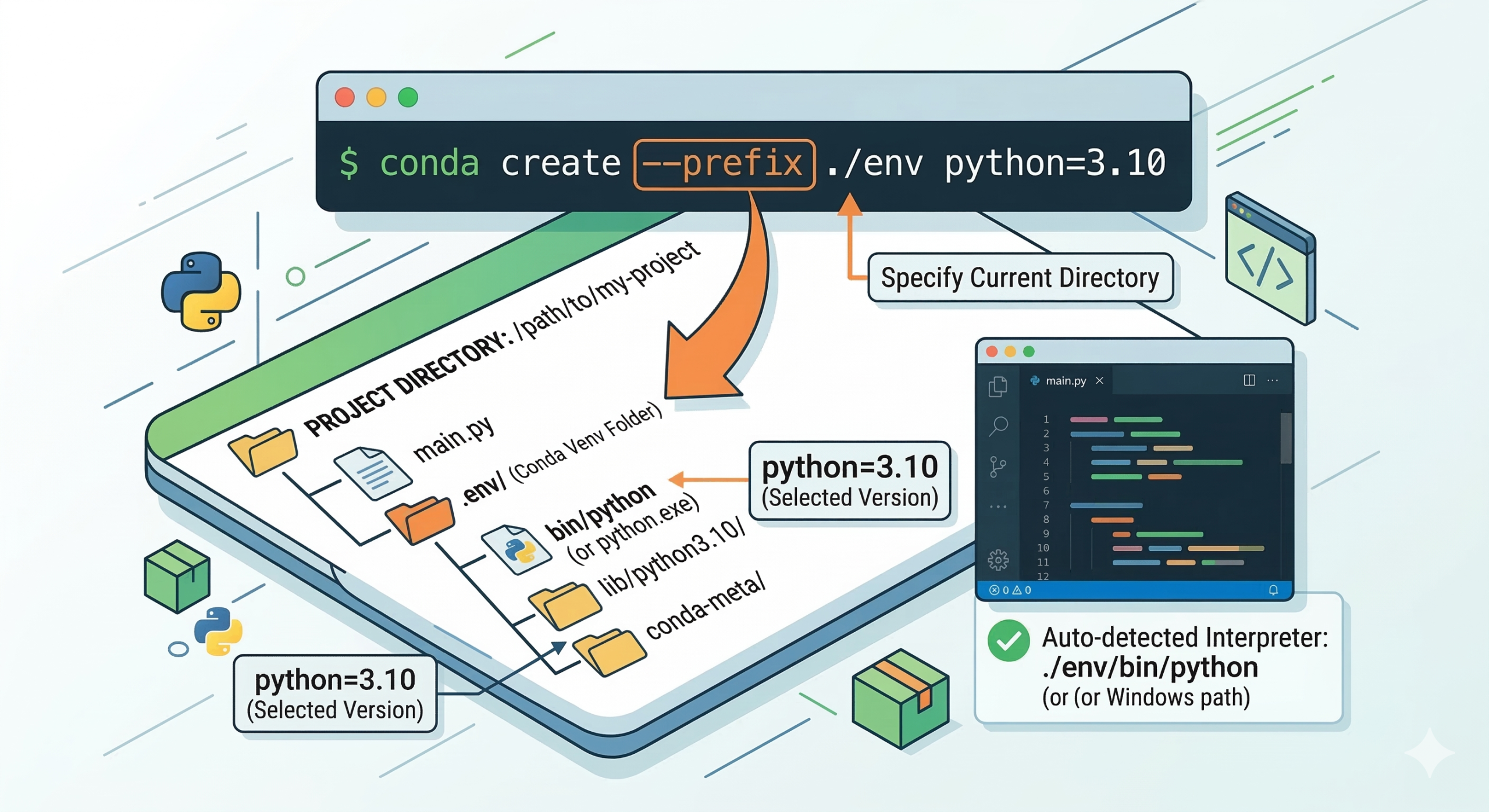 conda create:建立環境的基礎指令。--prefix ./env(或-p ./env):這是關鍵!它告訴 Conda 不要去預設目錄找位置,直接在當前路徑下建立一個名為env的資料夾。python=3.10:指定你需要的 Python 版本。Conda 會自動尋找並下載對應的解釋器。